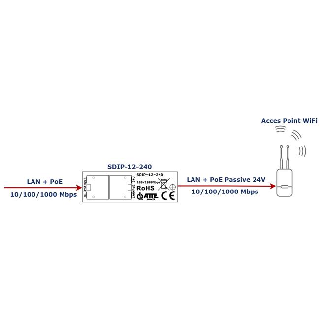 SDIP-12-240 to gigabitowy adapter PoE z przetwornicą obniżającą napięcie. Urządzenie pozwala na zmianę zasilania z PoE 802.3af lub PoE PASSIVE (35…56V) na PoE PASSIVE 24V.