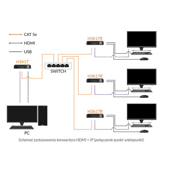 Sygnał IP wychodzący z nadajnika może być podany na switch ethernetowy celem podziału na większą liczbę odbiorników. Przepływność sygnału kompresowanego na wyjściu nadajnika wynosi około 15 Mbit/s.Do poprawnego zdekodowania sygnału przy większej liczbie urządzeń wyświetlających obraz, konieczny jest odbiornikH3617R- podgląd obrazu na komputerze PC wyposażonym w kartę sieciową jest niemożliwy.