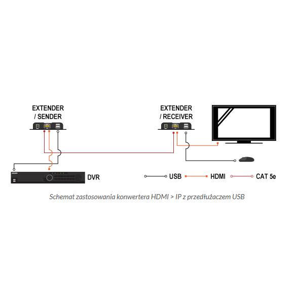 Konwerter HDMI na IP umożliwia podłączenie sygnału wysokiej rozdzielczości (HD) do odbiornika (telewizor, monitor) poprzez sieć IP. Przedłużacz USB.